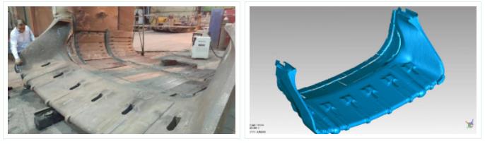 客戶使用傳統卡尺測量建模的方法對挖斗進行逆向建模,經常會遇到諸如測量速度慢、曲面測量不準確、無法對復雜曲面進行 測量等問題,建模很大程度取決于工程師的感覺,不可能做到1:1還原??蛻粝Mㄟ^三維測量,解決建模精準度和建模規范化的 問題。