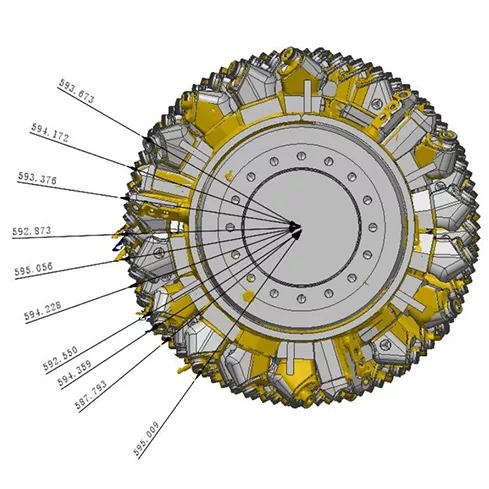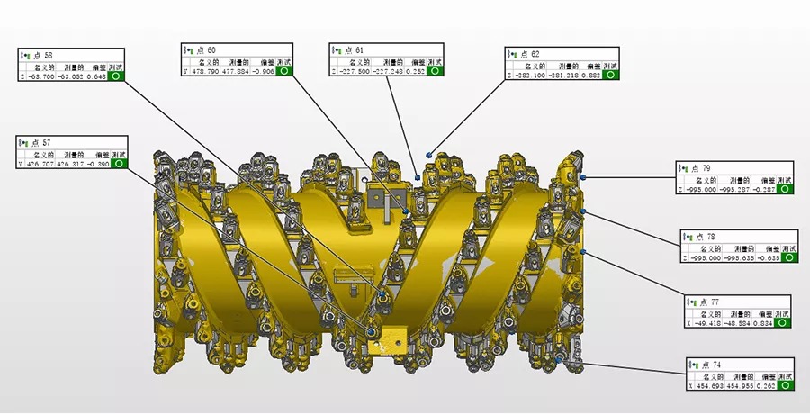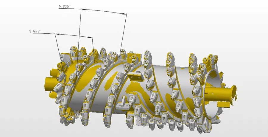 銑刨鼓是道路銑刨機的核心,需經過嚴格的檢測,以避免磨損以及變形的負荷縮短設備使用壽命。過去采用接觸式打點來進行檢測,不但測量速度慢,而且測量死角多,測量數據不全,且銑刨鼓的刀頭為活動刀頭,裝配后測量無法測得準確的刀頭點位。