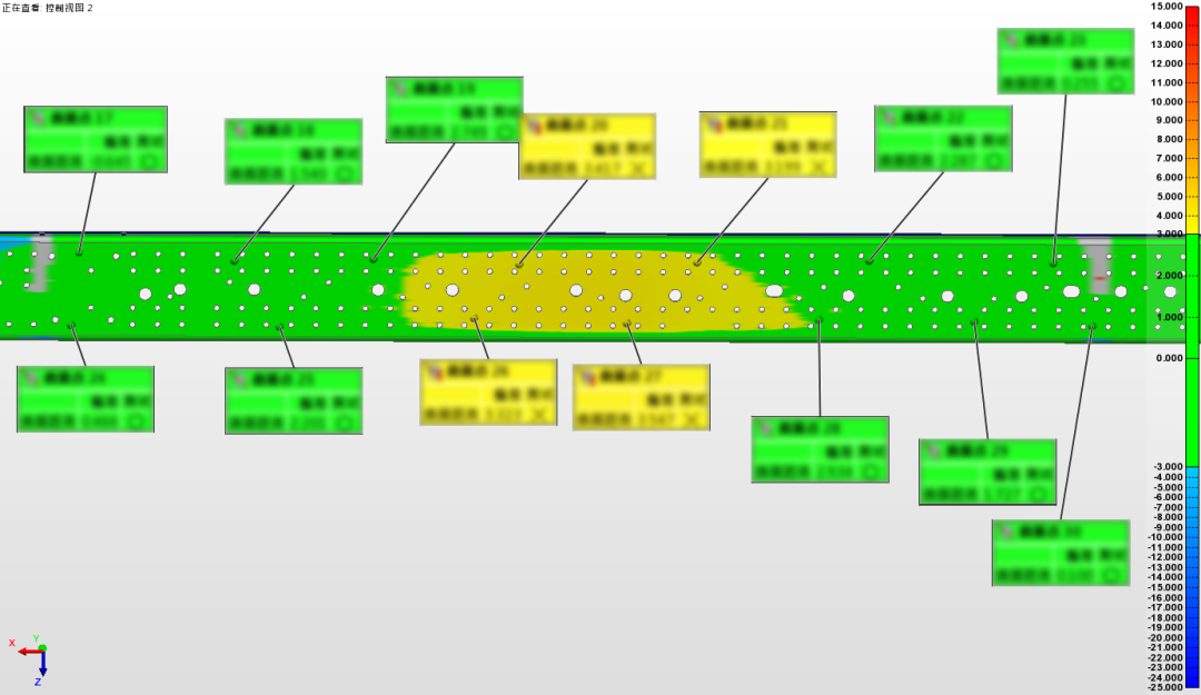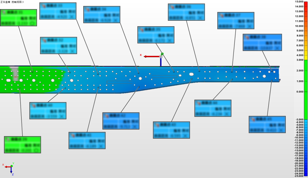這一方案可實現孔位快速高精度檢測,有效檢測車架孔位是否滿足設計要求,確保后續車架裝配質量及其他部件裝配位置精度。同時,型面檢測結果能夠更加精準地反映出模具加工精度和材料變形量,這些數據對前期加工分析都能提供很大幫助。